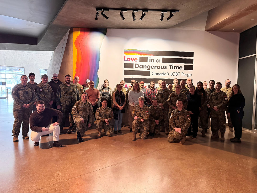 On 26 Jan 26, members of 17 Wing had the opportunity to visit the Canadian Museum of Human Rights (CMHR) in Winnipeg for a guided tour of the exhibit Love in a Dangerous Time. The exhibit explores a difficult chapter in Canadian history: the systematic discrimination and dismissal of 2SLGBTQI+ federal public servants during what is now commonly referred to as “the Purge.”